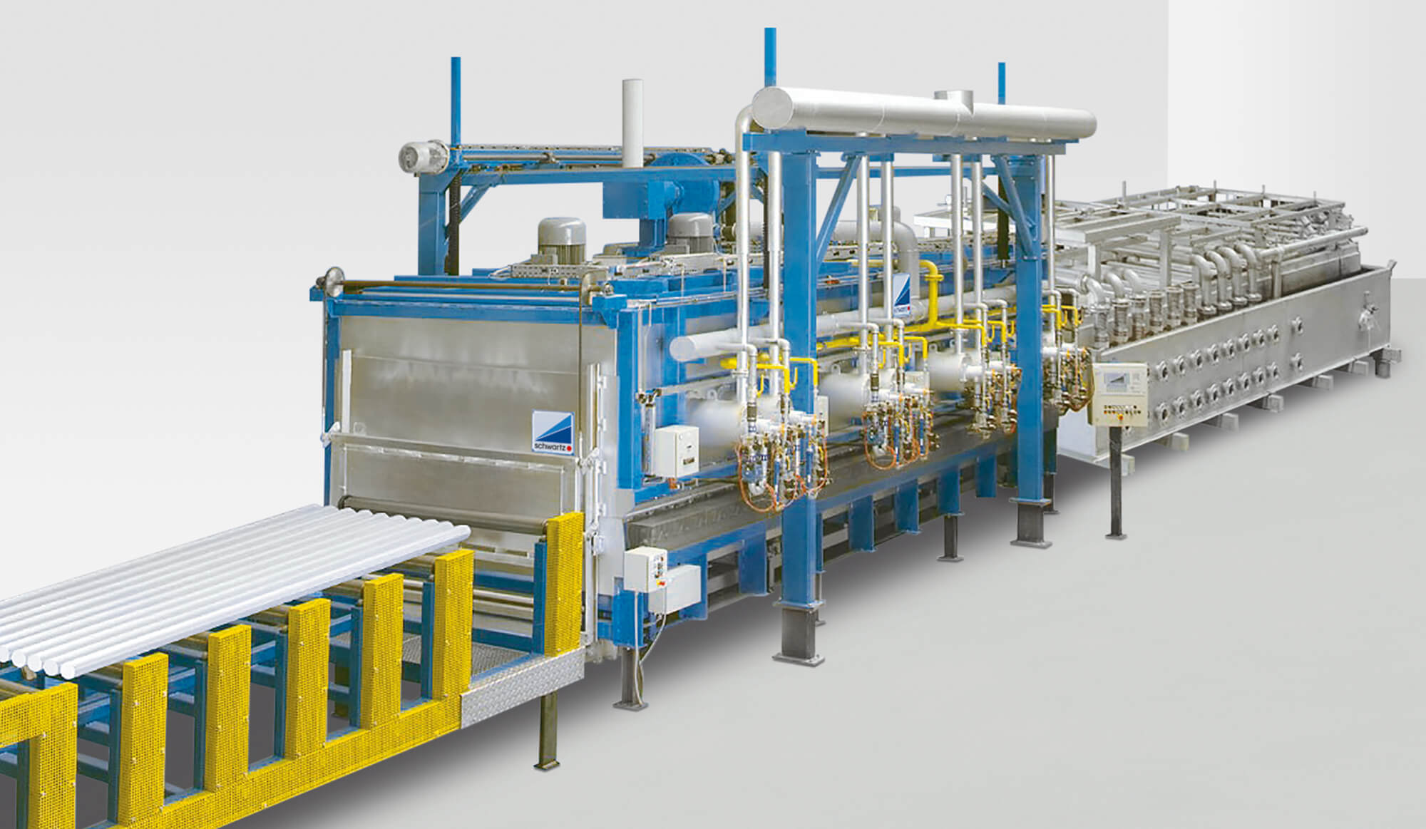 Chamber furnaces are loaded by means of a bogie or by placing the loads on trays. In our roller-hearth furnace for solution-annealing aluminum rods and sections, the load moves horizontally on a roller conveyor into the heating chamber. The heat treatment is carried out by high convection with the load resting on a reversible roller track. Upon completion of the annealing process, the product is advanced quickly into the adjoining high-pressure and low-pressure water quench and finally dried.